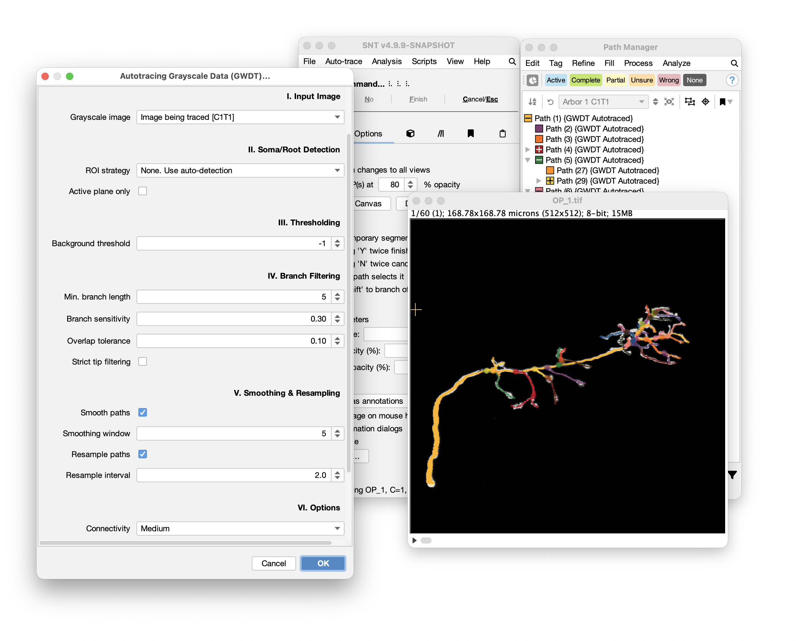 SNT’s grayscale autotracing has been implemented with substantial re-engineering/improvements: